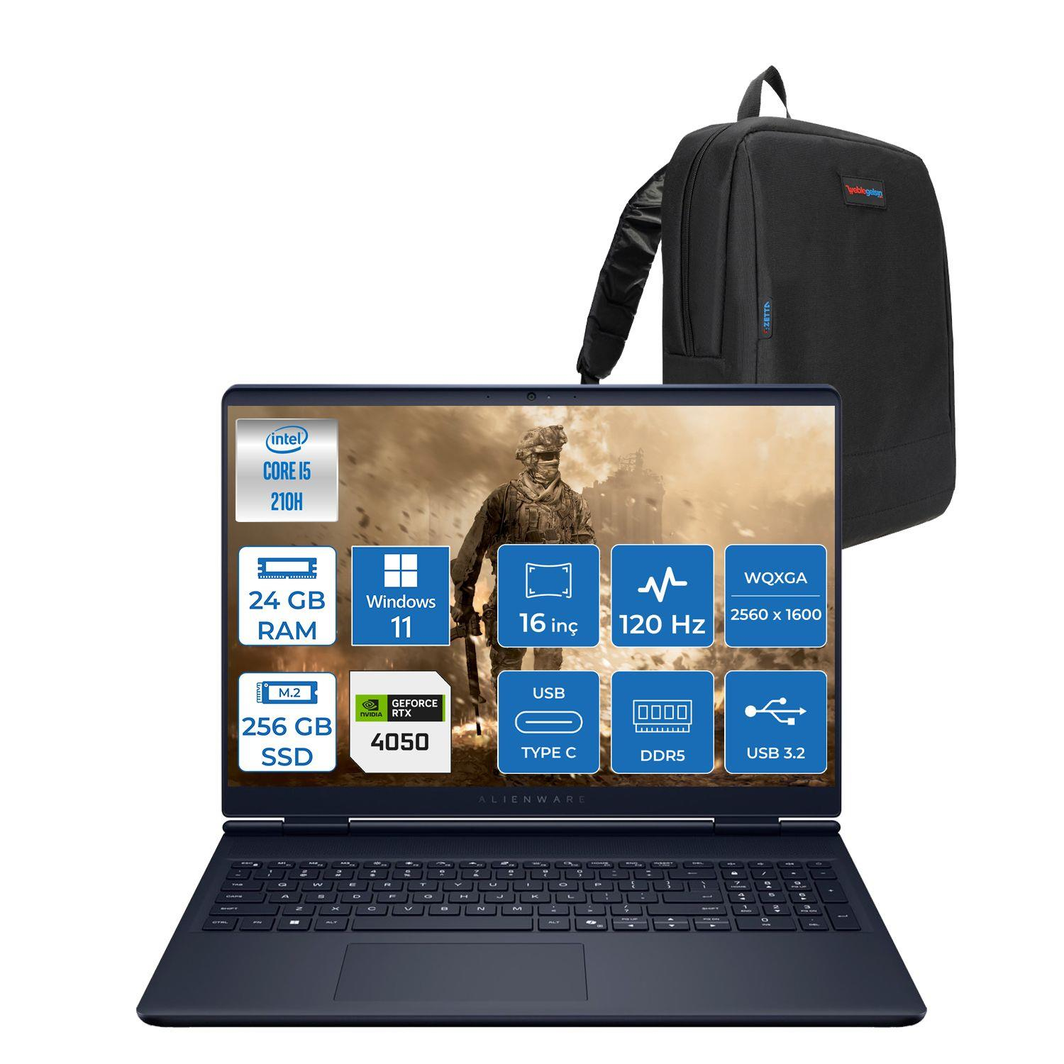 Dell Alienware 16 Aurora Intel Core 5 210H 24GB DDR5 256GB SSD RTX4050 6gb 85W Windows 11 Pro 16" WQXGA(2560X1600) 120Hz 300NITS Taşınabilir Bilgisayar AC16250P06